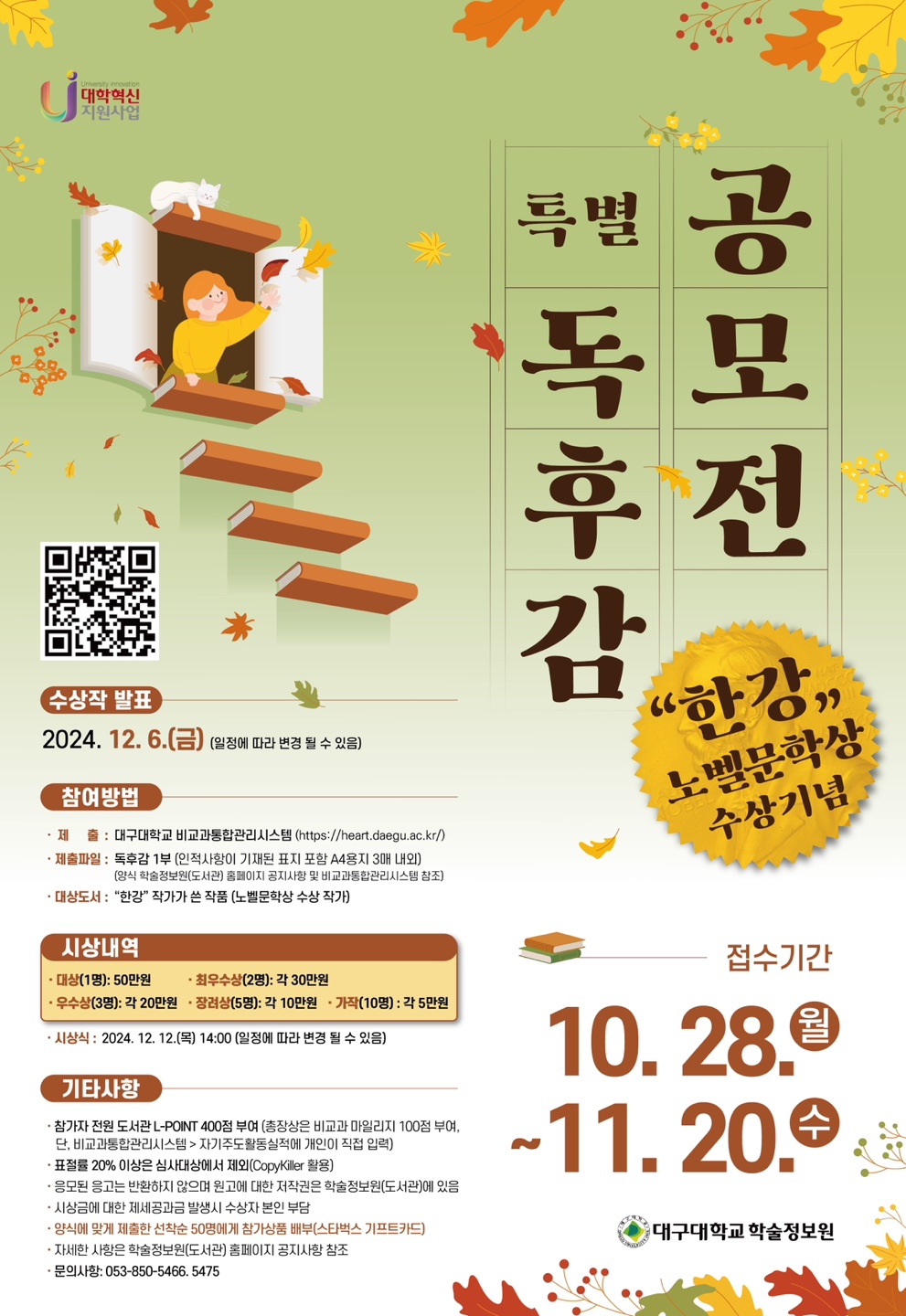 「2024년 '한강' 노벨문학상 수상 기념 특별 독후감 공모전」을 실시 하오니 많은 관심과 참여 바랍니다.