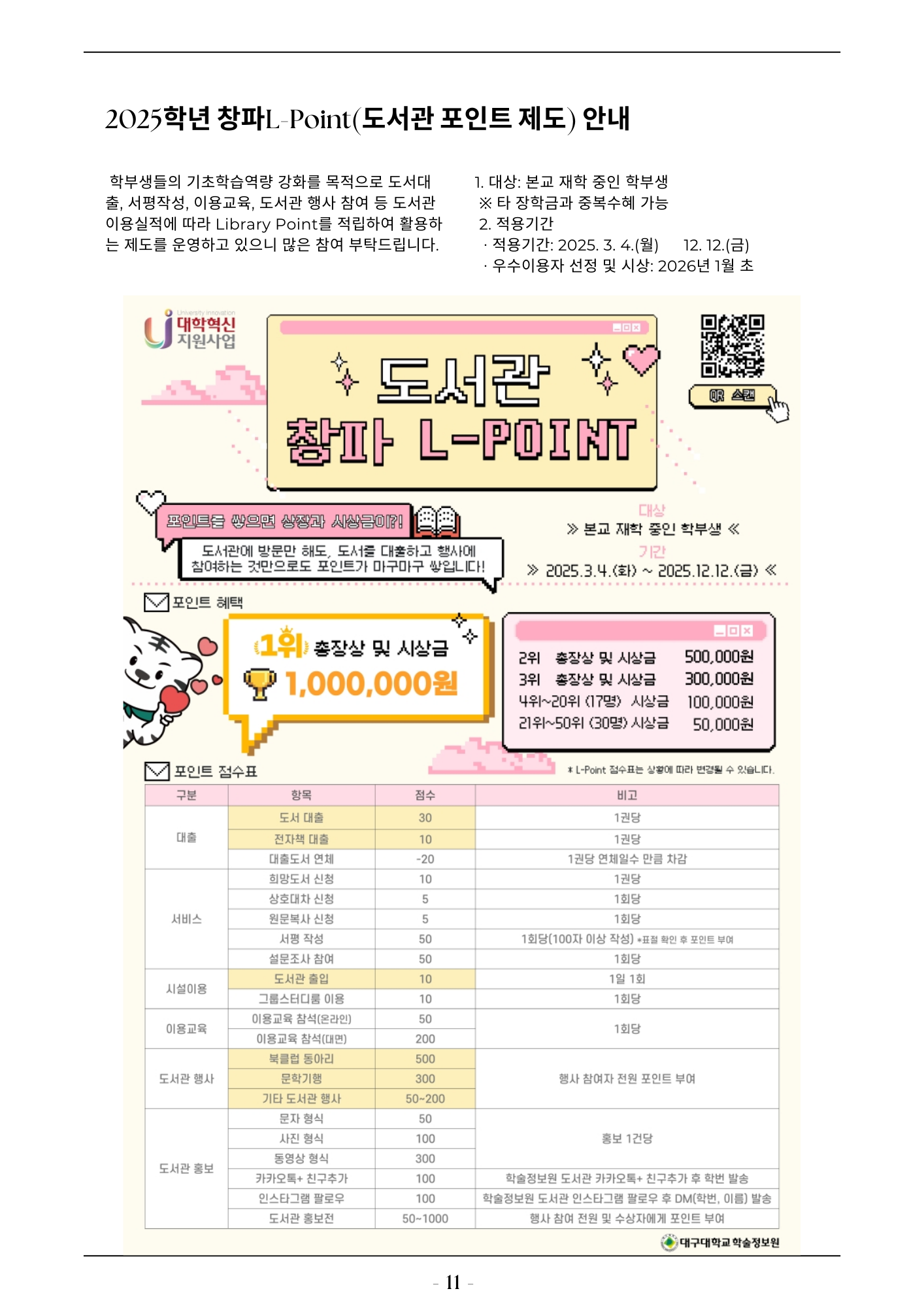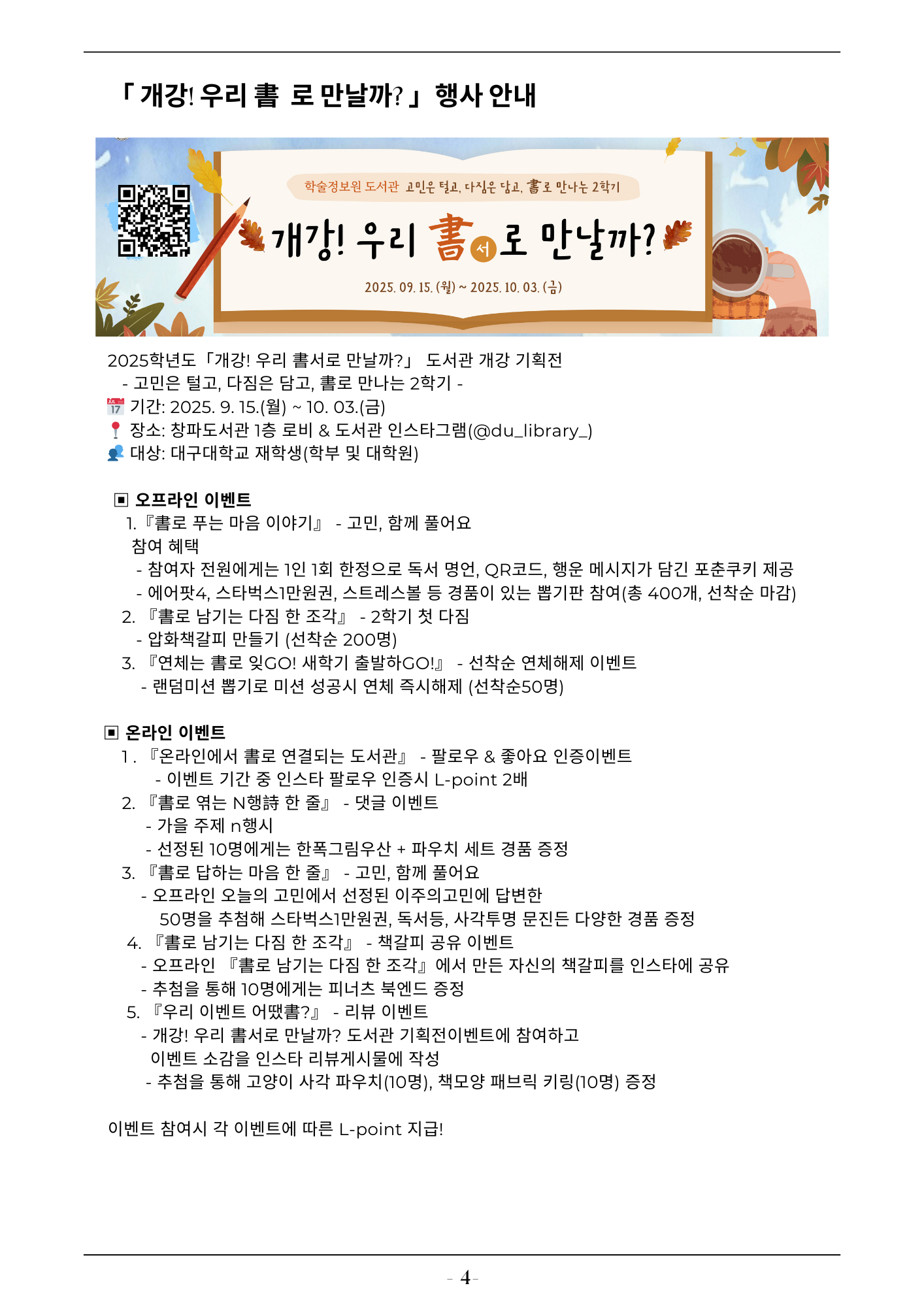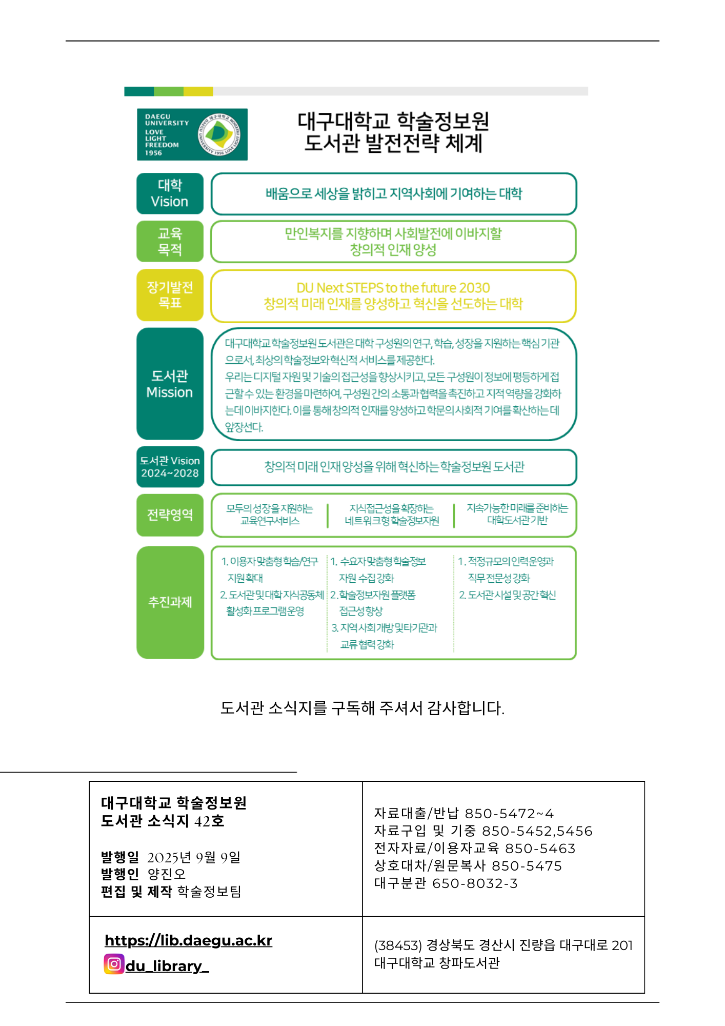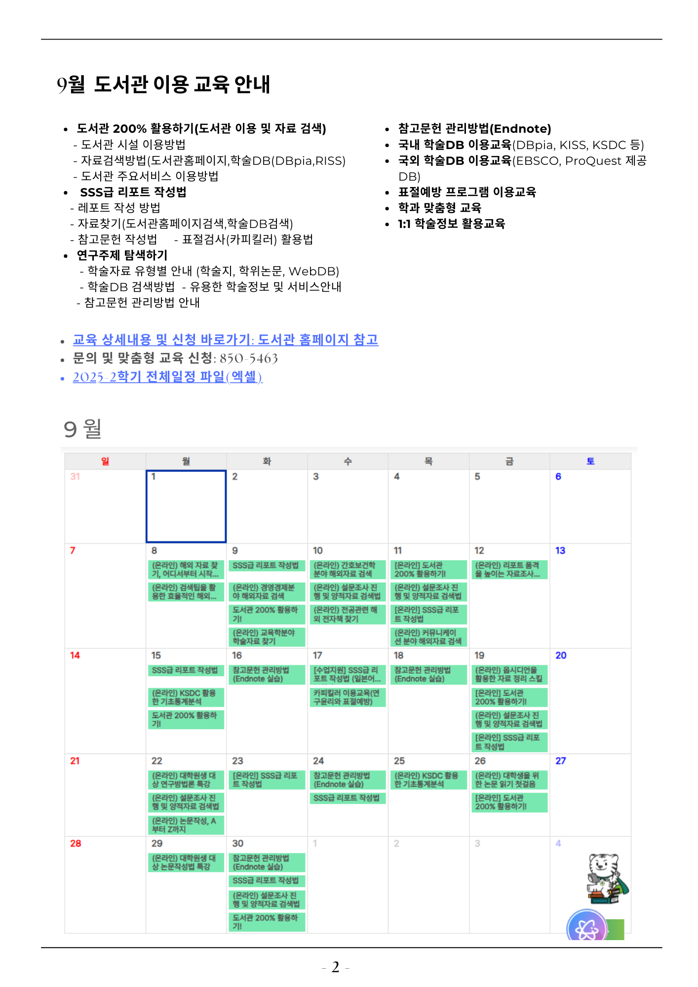 | 2025학년도 2학기 학술정보원 도서관 운영 시간 안내 (0) | 2025.10.14 |