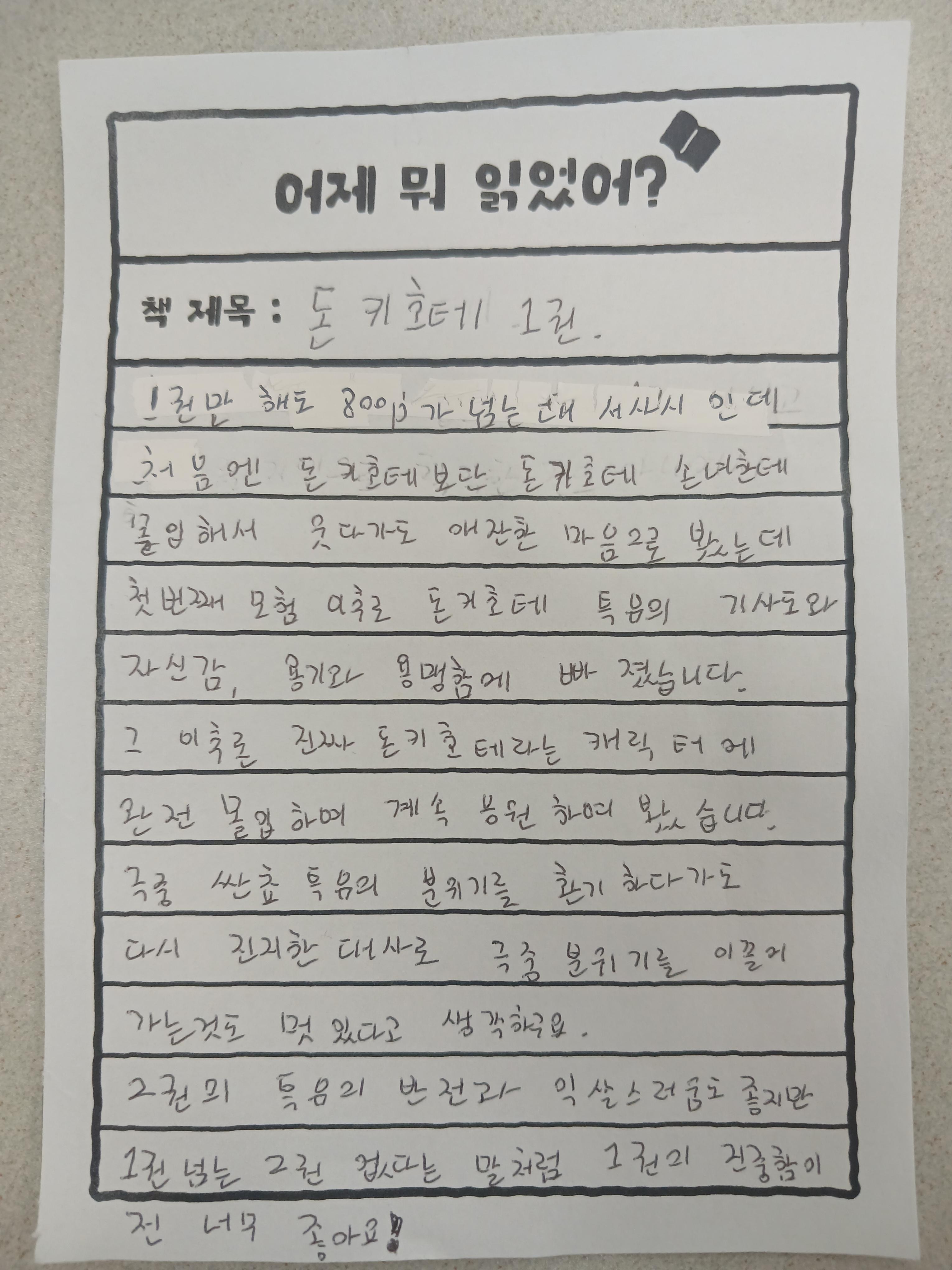 1권만 해도 800p가 넘는데 서사시인데 처음엔 돈키호테보단 돈키호테 손녀한테 몰입해서 웃다가도 애잔한 마음으로 봤는데 첫 번째 모험 이후로 돈키호테 특유의 기사도와 자신감, 용기와 용맹함에 빠졌습니다. 그 이후론 진짜 돈키호테라는 캐릭터에 완전 몰입하며 계속 응원하며 봤습니다. 극중 싼쵸 특유의 분위기를 환기하다가도 다시 진지한 대사로 극중 분위기를 이끌어 가는 것도 멋있다고 생각하구요. 2권의 특유의 반전과 익살스러움도 좋지만 1권 넘는 2권 없다는 말처럼 1권의 진중함이 전 너무 좋아요!