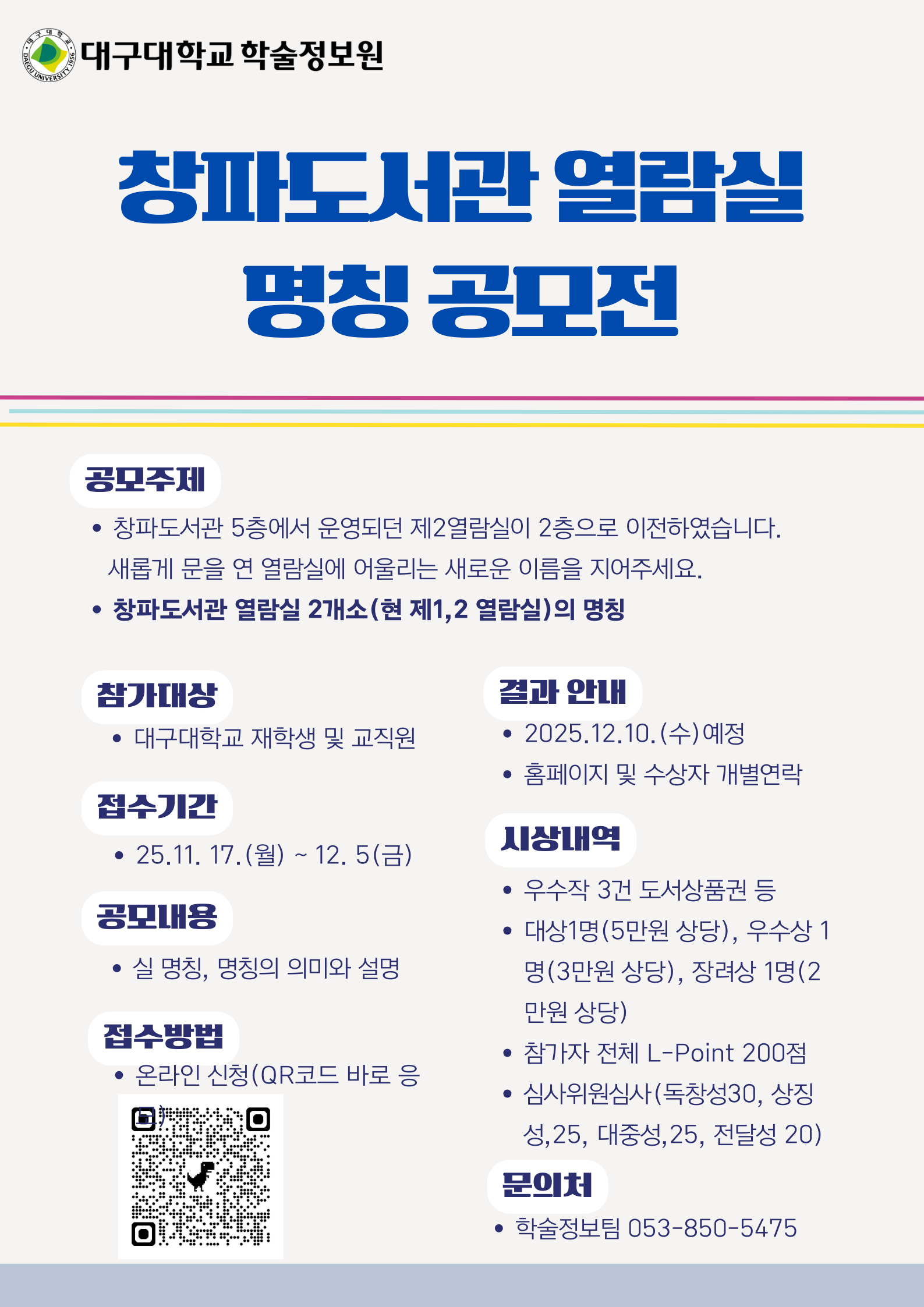 | 대구대학교, 창파도서관 '제2열람실' 개소식 개최 (0) | 2025.10.31 |