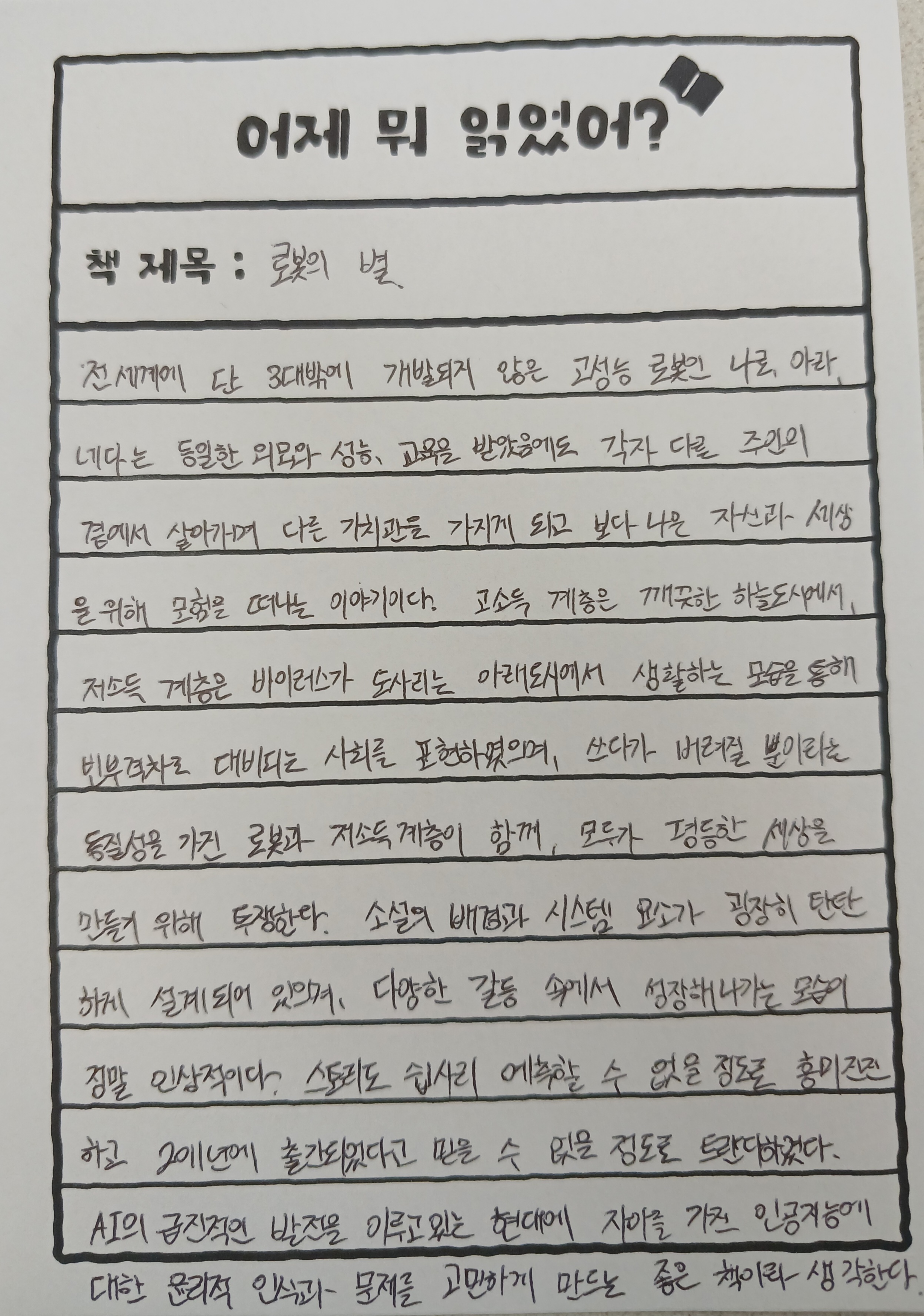 전 세계에 단 3대밖에 개발되지 않은 고성능 로봇인 나로 ,아라, 네다는 동일한 외모와 성능, 교육을 받았음에도 각자 다른 주인의 곁에서 살아가며 다른 가치관을 가지게 되고 보다 나은 자신과 세상을 위해 모험을 떠나는 이야기이다. 고소득 계층은 깨끗한 하늘도시에서, 저소득 계층은 바이러스가 도사리는 아래 도시에서 생활하는 모습을 통해 빈부격차로 대비되는 사회를 표현하였으며, 쓰다가 버려질 뿐이라는 동질성을 가진 로봇과 저소득계층이 함께, 모두가 평등한 세상을 만들기 위해 투쟁한다. 소설의 배경과 시스템 요소가 굉장히 탄탄하게 설계되어 있으며, 다양한 갈등 속에서 성장해나가는 모습이 정말 인상적이다. 스토리도 쉽사리 예측할 수 없을 정도로 흥미진진하고 2011년에 출간되었다고 믿을 수 없을 정도로 트렌디하였다. AI의 급진적인 발전을 이루고 있는 현대에 자아를 가진 인공지능에 대한 윤리적 인식과 문제를 고민하게 만드는 좋은 책이라 생각한다.