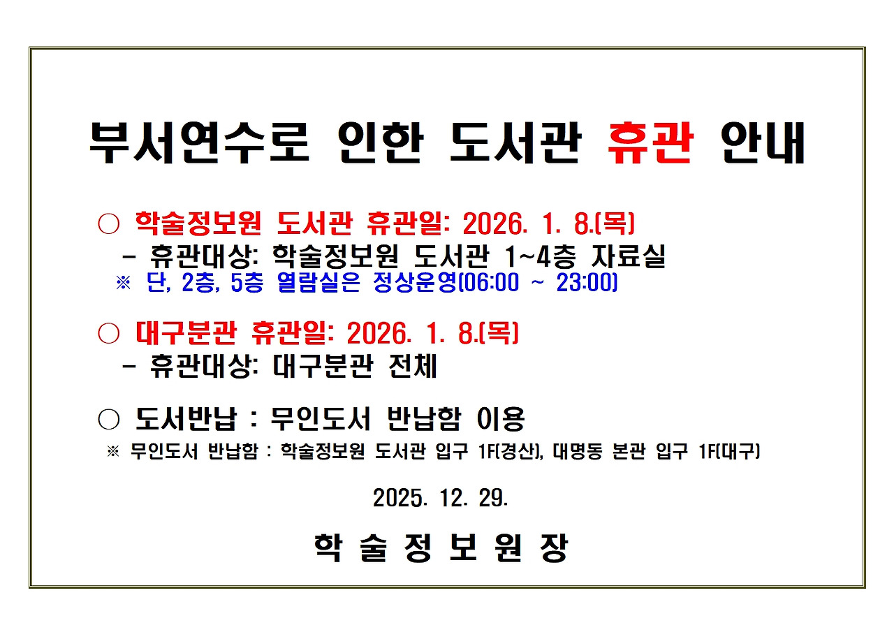 | 학술정보원(도서관) 설 연휴 휴관 안내 (0) | 2026.02.11 |