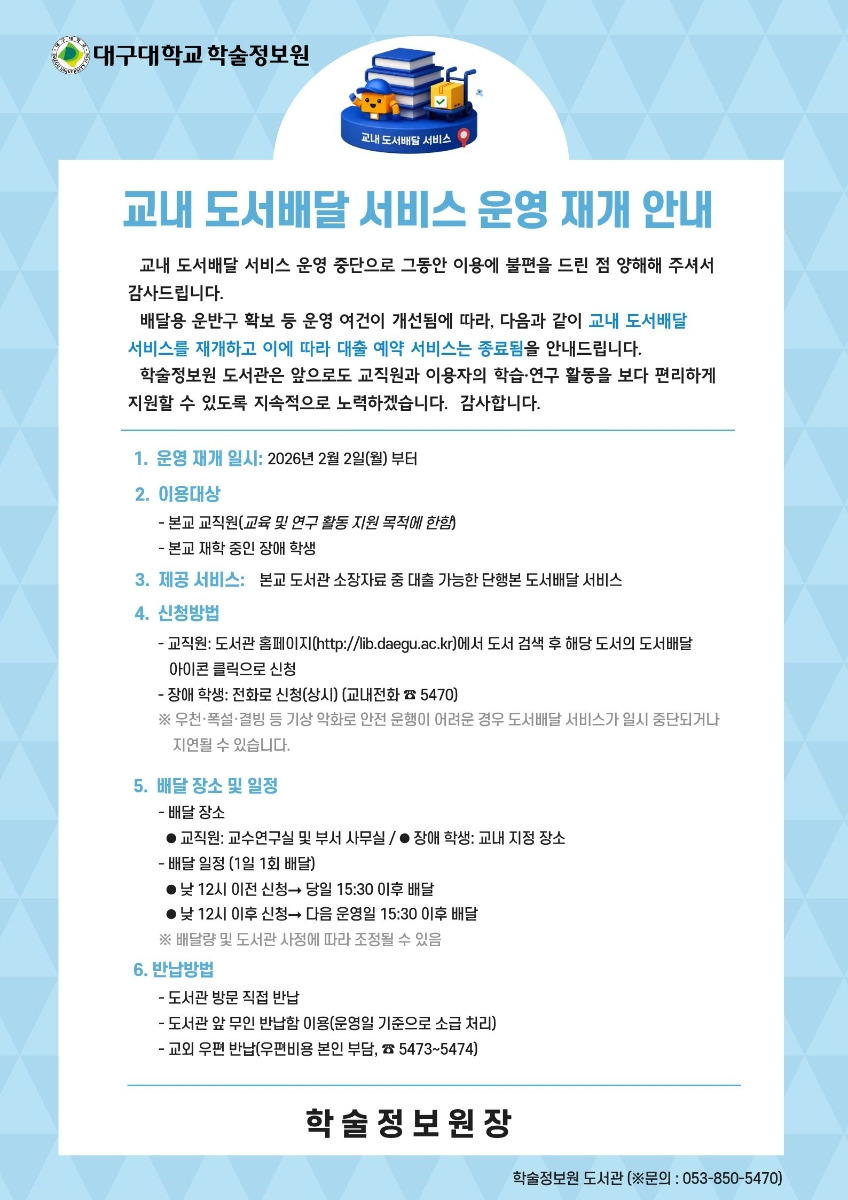 교내 도서배달 서비스 운영 재개 안내