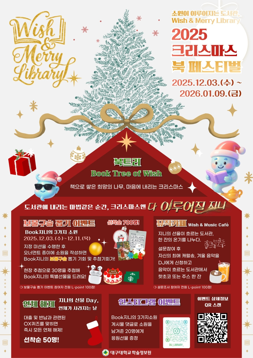 🎄 『소원이 이루어지는 도서관, Wish & Merry Library』🎄“도서관에 내리는 마법 같은 순간, 크리스마스엔 다 이루어질지니” 한 해의 끝자락, 도서관이 가장 따뜻하게 빛나는 계절이 찾아왔습니다.☃️❄️올해도 학술정보원 도서관 1층 로비에는 약 4,000권의 책으로 만든 대형 북트리가 세워져,소원 오너먼트와 겨울 음악, 그리고 북카페의 따뜻한 향기와 함께 여러분을 맞이합니다.🎄특히 올해는 소원 미션을 통해 ‘보물구슬(북캡슐)’을 뽑을 수 있는 특별한 이벤트가 준비되어 있습니다.보물구슬 속에는 북지니가 전하는 위로와 응원의 메시지, 그리고 다양한 행운의 경품이 담겨 있어여러분의 연말에 작지만 설레는 기쁨을 더해줄 것입니다.🧞2025년을 차분히 마무리하고,다가올 2026년의 소망을 조용히 ..