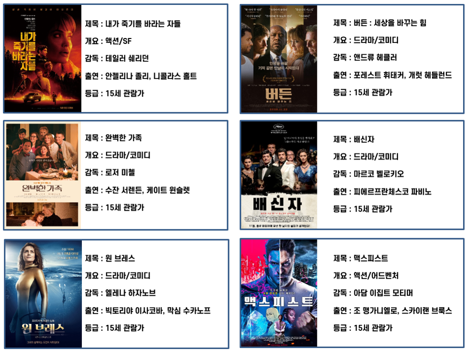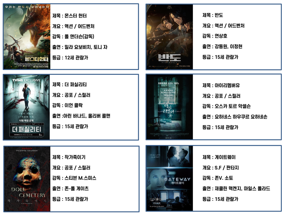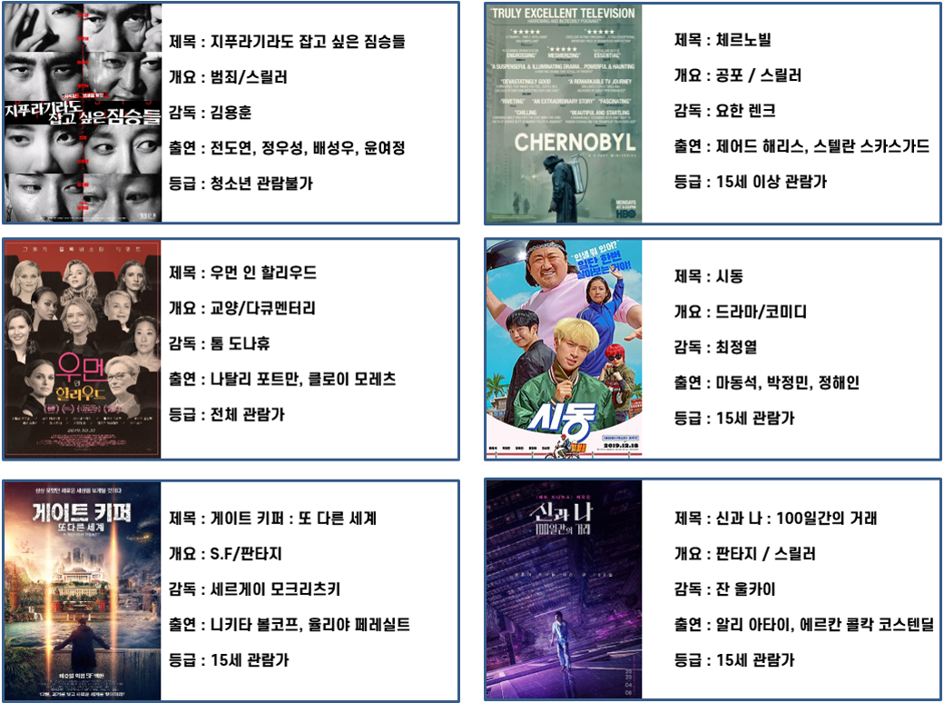 이달의 최신영화(DVD) 안내 창파도서관 창의융합프라자 미디어실에서는 문화공간으로의 서비스 지원을 위하여 다음과 같이 최신 영화(DVD) 자료를 제공하고 있습니다. 많은 이용 바랍니다. ※이용방법 창파도서관 홈페이지 → 도서관서비스 → 그룹스터디룸/시설이용 → DVD룸 예약 예약 후 신분증 지참하여 1층 창의융합프라자로 오시면 안내해드리겠습니다. Movie 2021.09.09