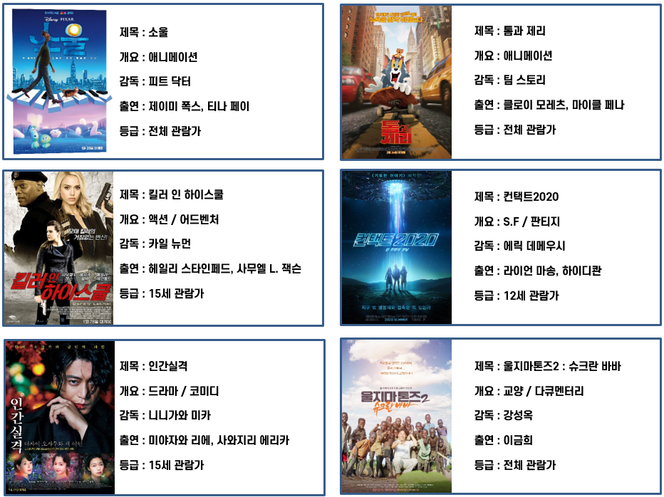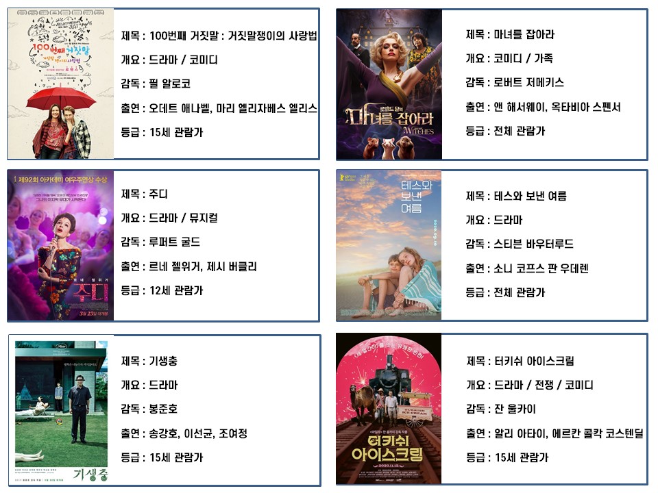 2021년 5월 최신DVD 창파도서관 창의융합프라자 미디어실에서는 문화공간으로의 서비스 지원을 위하여 다음과 같이 최신 영화(DVD) 자료를 제공하고 있습니다. 많은 이용 바랍니다. ※이용방법 창파도서관 홈페이지 → 도서관서비스 → 그룹스터디룸/시설이용 → DVD룸 예약 예약 후 신분증 지참하여 1층 창의융합프라자로 오시면 안내해드리겠습니다. Movie 2021.05.12