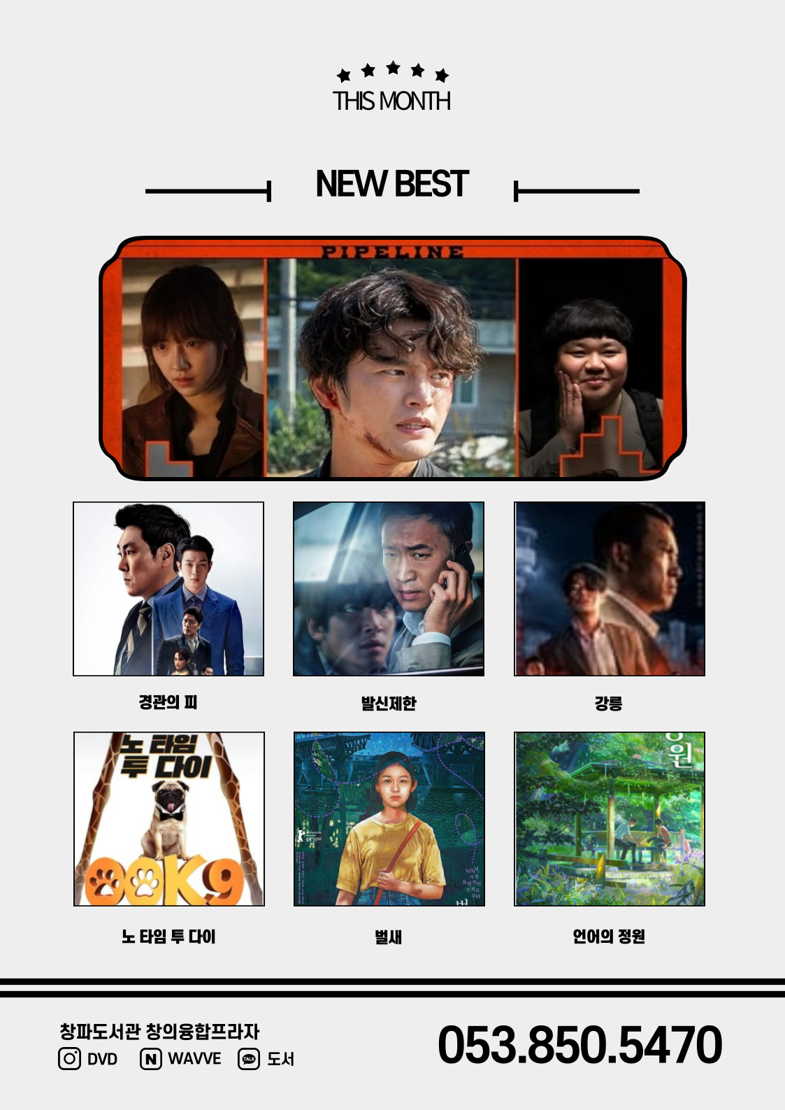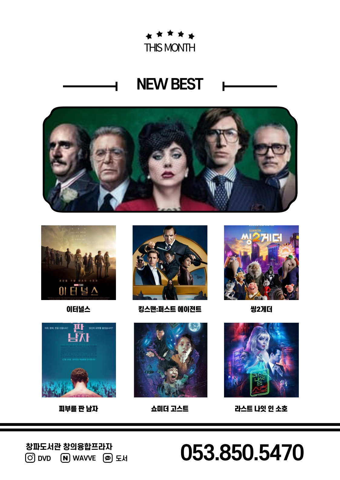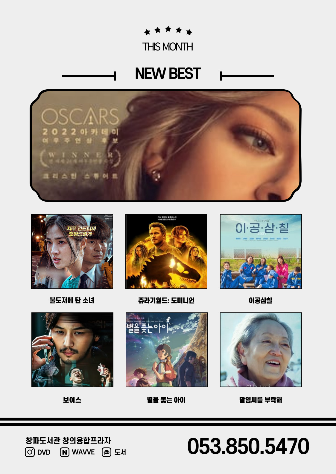 2022년 4월 최신 DVD BEST 창파도서관 창의융합프라자 미디어실에서는 문화공간으로의 서비스 지원을 위하여 다음과 같이 최신 영화(DVD) 자료를 제공하고 있습니다. 많은 이용 바랍니다. ※이용방법 창파도서관 홈페이지 → 도서관서비스 → 그룹스터디룸/시설이용 → DVD룸 예약예약 후 신분증 지참하여 1층 창의융합프라자로 오시면 안내해드리겠습니다. Movie 2022.04.18