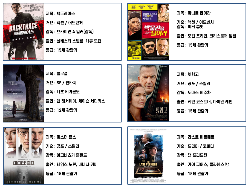 이달의 최신영화(DVD) 안내 창파도서관 창의융합프라자 미디어실에서는 문화공간으로의 서비스 지원을 위하여 다음과 같이 최신 영화(DVD) 자료를 제공하고 있습니다. 많은 이용 바랍니다. ※이용방법 창파도서관 홈페이지 → 도서관서비스 → 그룹스터디룸/시설이용 → DVD룸 예약 예약 후 신분증 지참하여 1층 창의융합프라자로 오시면 안내해드리겠습니다. Movie 2021.11.01