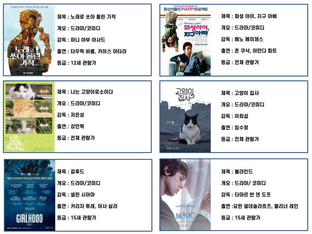 6월 최신영화(DVD) 안내 창파도서관 창의융합프라자 미디어실에서는 문화공간으로의 서비스 지원을 위하여 다음과 같이 최신 영화(DVD) 자료를 제공하고 있습니다. 많은 이용 바랍니다. ※이용방법 창파도서관 홈페이지 → 도서관서비스 → 그룹스터디룸/시설이용 → DVD룸 예약 예약 후 신분증 지참하여 1층 창의융합프라자로 오시면 안내해드리겠습니다. Movie 2021.06.22